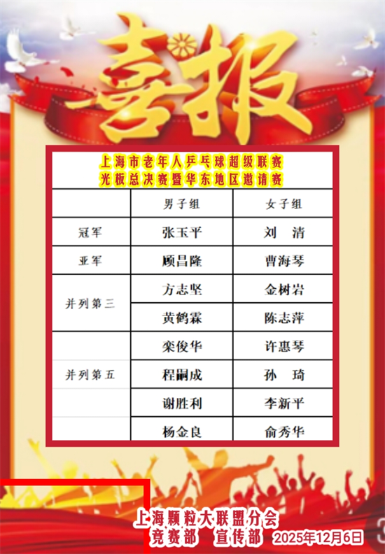 | 2025-12-07 | 上海市老年人体育协会乒乓球委员会 |