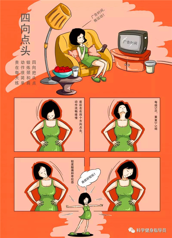 2、四向点头 放松颈部肌肉,改善肩颈部不适,预防颈椎病。
